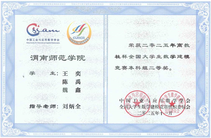 近日,全国大学生数学建模竞赛组委会公布了2025年数学建模竞赛获奖名单,best365官网学生王奕、陈禹、魏鑫组成的参赛队(指导老师刘炳全)喜获全国二等奖,此外,best365官网学子还获得陕西省一等奖5项、二等奖14项。