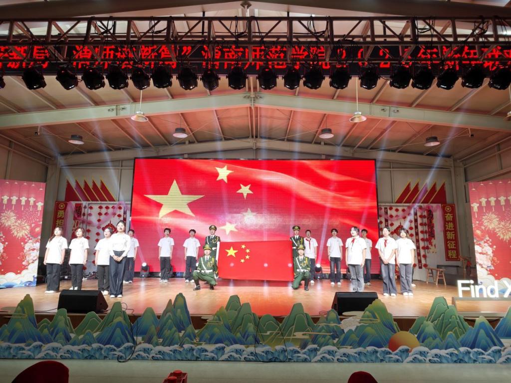 晚会中篇以“智启未来”为核心,展现学校开放包容、锐意进取的发展格局。华阴老腔《女娲补天》以国家非遗之韵吼出炼石补天的千古担当,彰显扎根渭南、弘扬地方文化的坚定信念;合唱《一路生花》唱响开放合作的青春和声,呼应学校共青团共建交流拓展“朋友圈”的生动实践;舞台剧《三面国旗》讲述了一名西部计划志愿者与天安门广场国旗的真实故事;舞蹈《中华民族一家亲》诠释“石榴籽般紧紧相拥”的中华民族共同体意识;《青春溢彩》展现渭师志愿者的风采;舞蹈《天域》则以美育之韵引领师生探索精神高地。