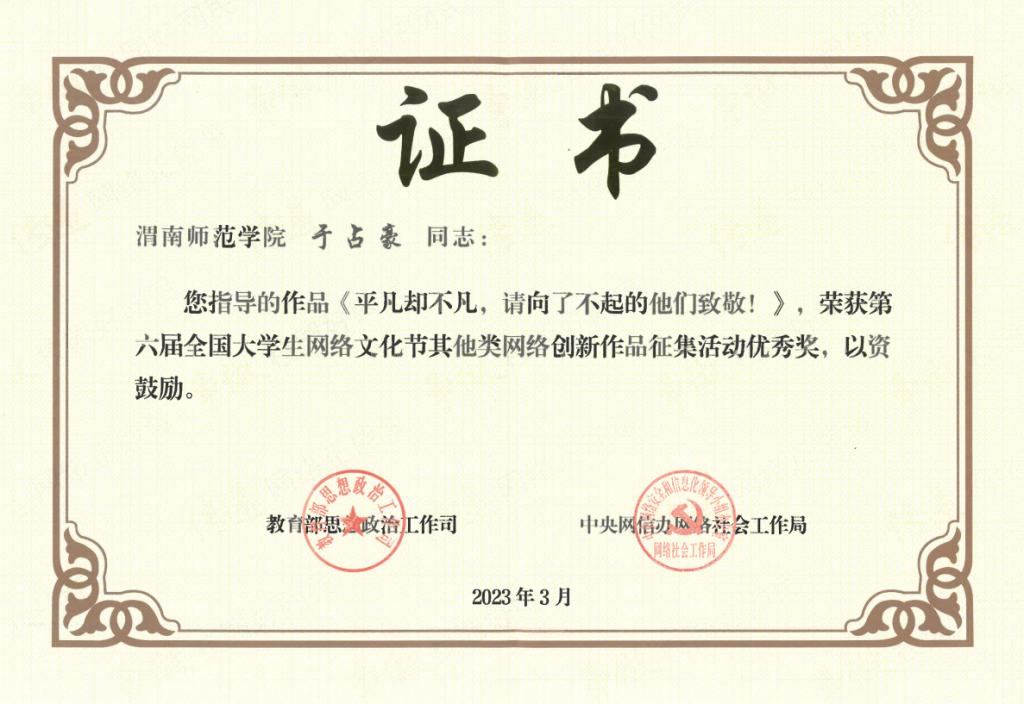近日,在教育部思想政治工作司、中央网信办网络社会工作局联合主办的第六届全国大学生网络文化节活动中,best365官网官微推文参选作品《平凡却不凡,请向他们致敬》荣获“其他类网络创新作品”优秀奖,这是best365官网两次参加全国大学生网络文化节活动以来,首次荣获该类奖项。