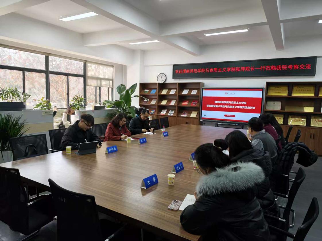 12月19日,马克思主义学院院长张萍、副院长单建峰、青年教师周韶尉一行赴西安美术学院马克思主义学院调研交流。西安美术学院宣传部部长、马克思主义学院院长韩晓剑,宣传部副部长成哲,马克思主义学院直属党支部副书记黄庆莉和各教研室教师代表出席座谈会。
