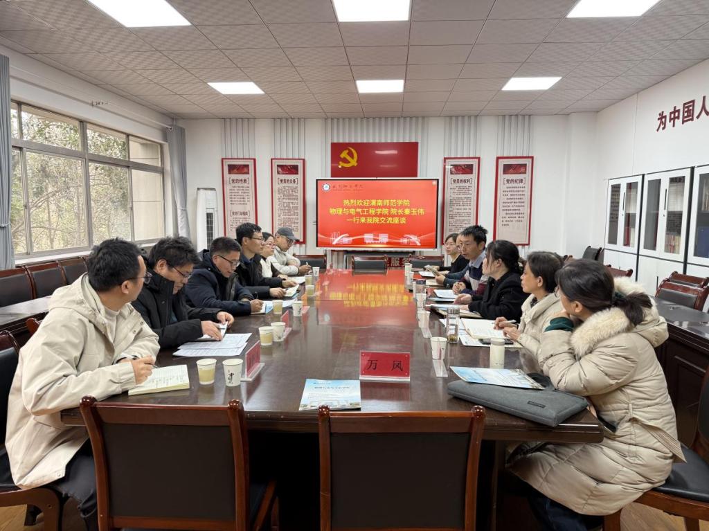 1月14日上午,物理与电气工程学院院长秦玉伟、副院长郭宝会、系主任冯洋、专业负责人朱高中、教师董陈岗、辅导员韦嘉豪一行6人赴咸阳师范学院物理与电子工程学院交流调研。咸阳师范学院物理与电子工程学院院长何东山、副院长华雪侠、副院长陈博及部分专业负责人和教师代表参加,双方开展座谈交流。