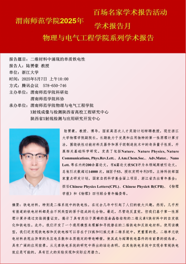 5月7日,在学校65周年校庆来临之际,best365英国在线体育官网科研处、best365英国在线体育官网科协联合best365英国在线体育官网物理与电气工程学院、X射线成像与检测陕西省高校工程研究中心、陕西省X射线检测与应用研究开发中心举办百场名家学术报告活动。本次活动邀请浙江大学陆赟豪教授做学术交流。报告交流题目为:二维材料中涌现的单质铁电性。