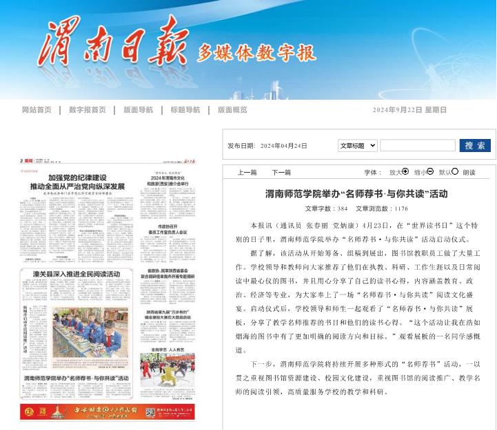 (六)宣传提质增效。图书馆十分重视宣传工作,2024年《best365英国在线体育官网举办“名师荐书 与你共读”活动启动仪式》引起了强烈反响,被《学习强国》《渭南日报》、新浪财经报道、学校官网、学校视频号报道;《深化全民阅读 建设书香校园》被渭南新闻网报道,被《渭南日报》微博转载;《“共沐书香美 共享阅读乐”读书笔记展》被《阳光报》报道。
