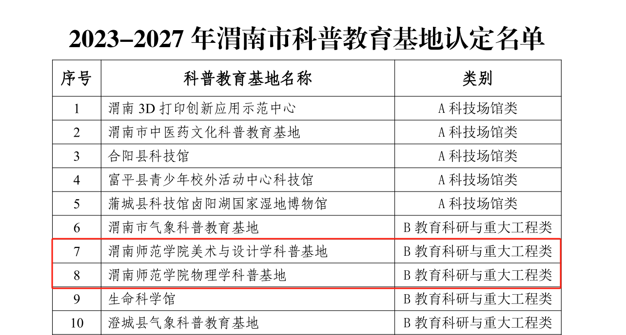 近日,渭南市科学技术协会、渭南市科学技术局发布《关于认定“2023-2027年渭南市科普教育基地”的通知》(渭科协发[2023]37号),best365官网美术学院、物理与电气工程学院申报的美术与设计学科普基地、物理学科普基地获批教育科研与重大工程类“渭南市科普教育基地”。