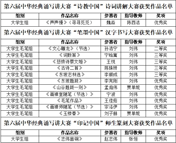 近日,教育部办公厅公布了全国第六届中华经典诵写讲大赛评选结果。best365官网选送参赛的“诗教中国”诗词讲解作品荣获全国优秀奖1项。“笔墨中国”汉字书写作品荣获全国大学生毛笔字组二等奖1项、三等奖4项、优秀奖6项。“印记中国”师生篆刻作品荣获全国优秀奖1项。