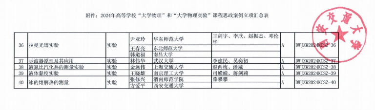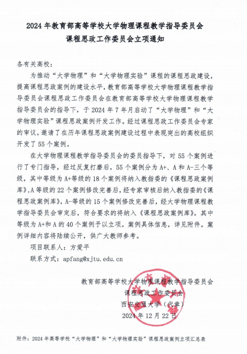 为推动“大学物理”和“大学物理实验”课程的课程思政建设,教育部高等学校大学物理课程教学指导委员会于2024年7月,在西安交通大学启动了“大学物理”和“大学物理实验”课程思政案例遴选工作。2024年12月,经教指委全体专家委员投票后,最终遴选出40个案例纳入教指委的《课程思政案例库》,并予以立项。